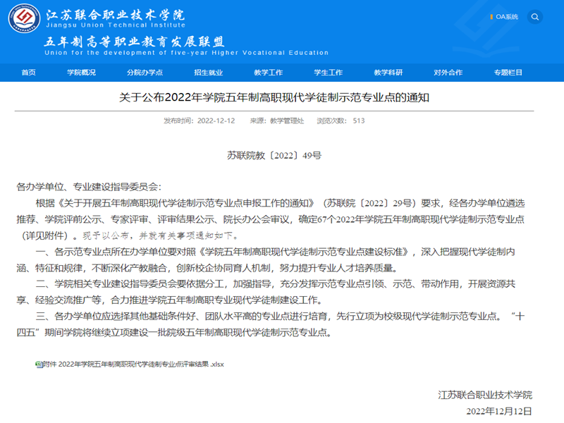 近日,根据江苏联合职业技术学院《关于公布2022年学院五年制高职现代学徒制示范专业点的通知》(苏联院教〔2022〕49号)的文件精神,船舶工程技术专业群入选学院五年制高职现代学徒制示范专业点。