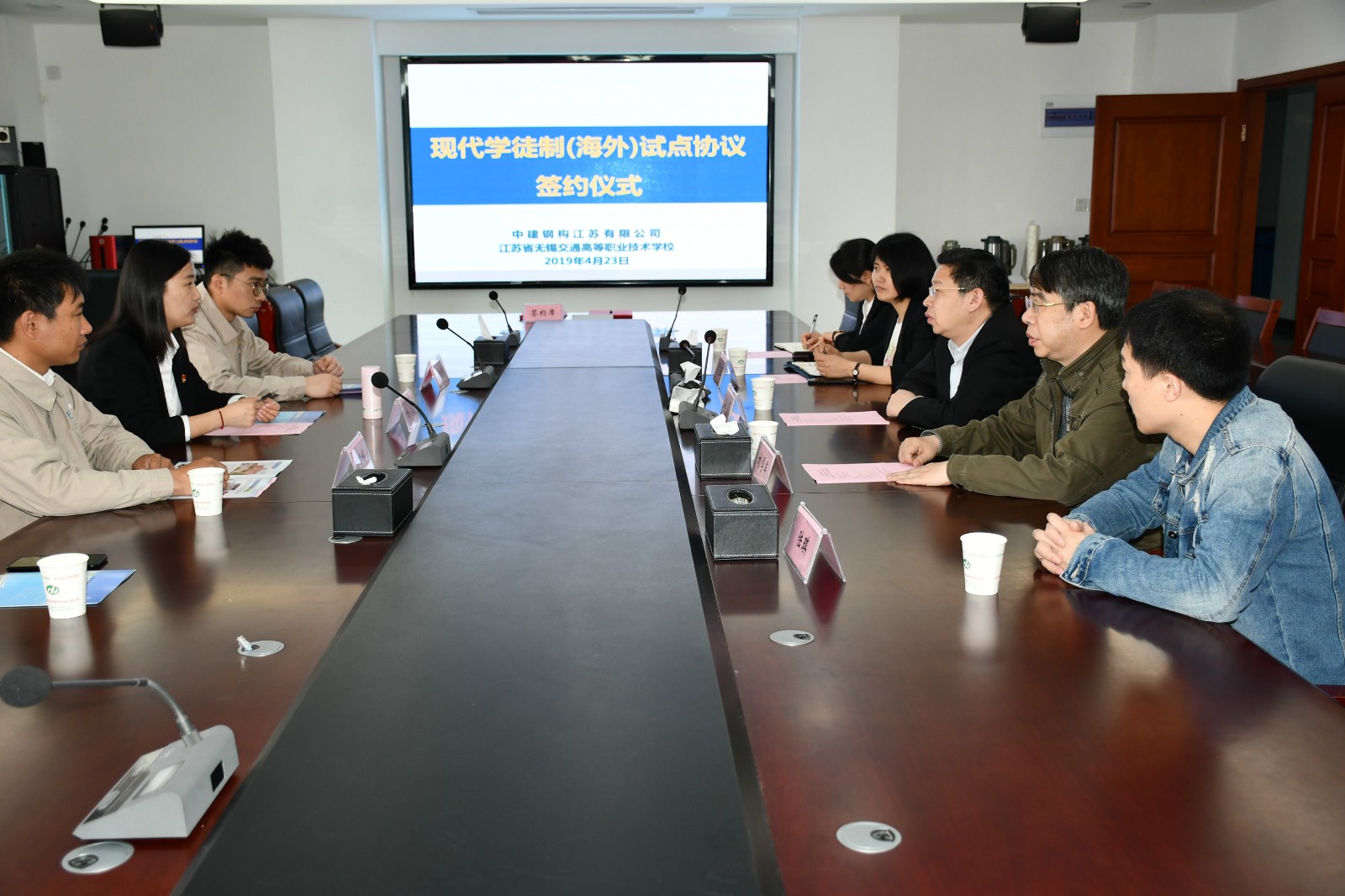 2019年4月23日上午,中建钢构江苏有限公司、开云官方站在线登入签订了现代学徒制(海外)试点协议。开云官方站在线登入党委书记李虎、学校招生就业处副处长刘学军、船舶工程学院党总支书记兼副院长吴志亚、船舶工程学院副院长刘方;中建钢构江苏有限公司党总支副书记金蕾,焊接中心主任邱明辉,焊培中心实验员缪晓泉等出席了签约仪式。