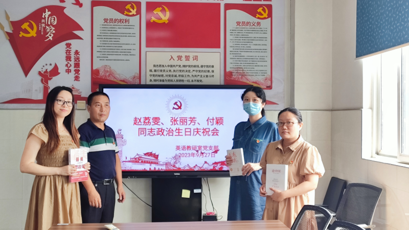 2023年9月27日下午,英语教研室党支部全体党员在部门会议室为赵荔雯、张丽芳、付颖三位党员同志庆祝“政治生日”。