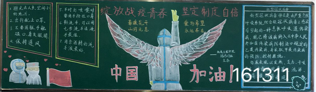 为全面打赢新冠肺炎疫情阻击战,做好抗疫知识宣传,5月13日,机电工程学院举办了以“绽放战疫青春,坚定制度自信”为主题的黑板报评比活动,此次活动共有18个班级参加。