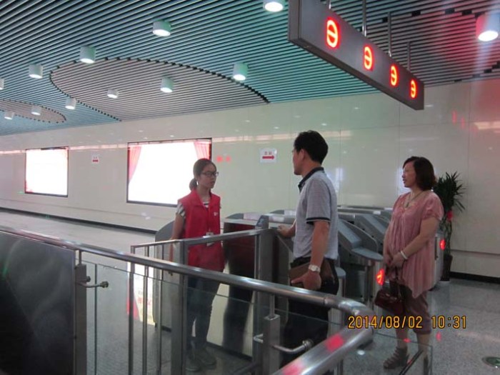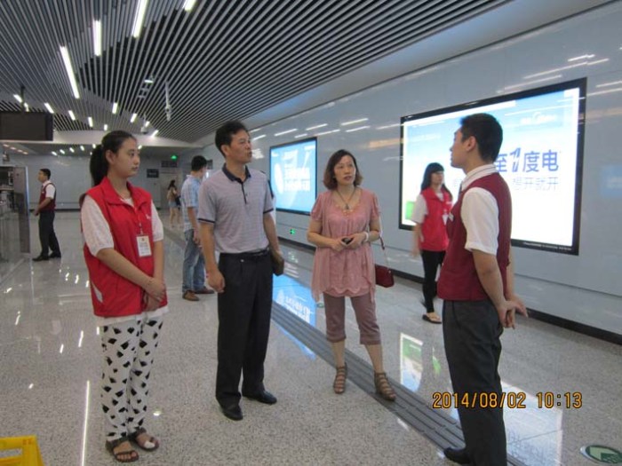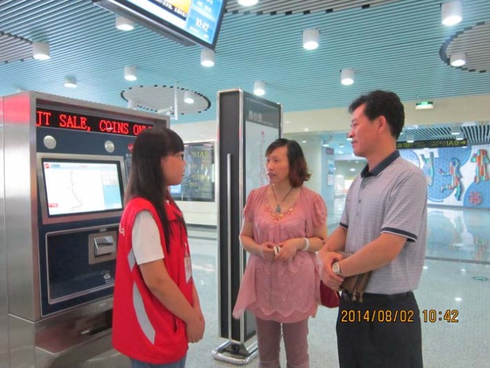 在一号线长广溪、江南大学两站站台上,耿校长一一询问志愿者们的工作情况,称赞同学们冒着炎炎酷暑,任劳任怨,为民志愿服务的高尚行为,表达了学校对志愿者工作的关心与慰问。在长广溪车站,耿校长还特地向该站杨枫站长询问我校志愿者工作的情况。杨站长对该站8名志愿者的表现很满意,称赞志愿者都能严格遵守操作规程,积极主动工作。最后同学们纷纷表示:我们将会用真诚的微笑和热情的服务帮助乘客购票、给乘客指引正确的进站和出站方向、主动帮助老年人和小孩、有秩序的组织乘客排队候车、照看好每一道安全门,让志愿者成为无锡绿色文明交通的倡导者,并人人努力争做优秀志愿者、共同争创优秀志愿者团队。