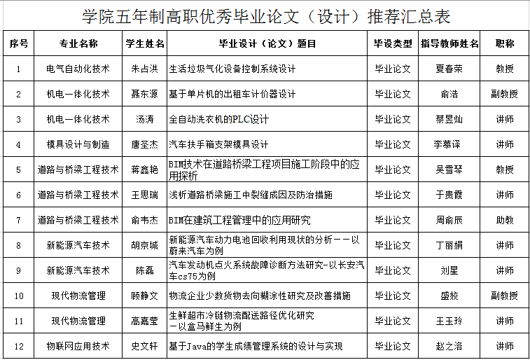 根据江苏联合职业技术学院《关于开展学院2023年度五年制高职优秀毕业论文(设计)认定工作的通知》(苏联院教〔2023〕30号),经各学院评审推荐,学校审核,拟推荐《基于单片机的出租车计价器设计》等12篇毕业论文,参加江苏联院五年制高职优秀毕业论文(设计)认定。具体名单见附件。