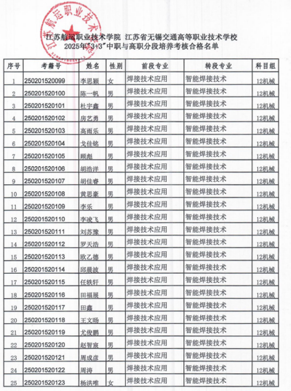 根据学校与江苏航运职业技术学院关于2022级焊接技术应用专业中高职“3+3”分段培养项目的合作规定,以及《关于进一步完善现代职业教育体系建设试点项目转段升学工作的意见(试行)》(苏教职[2014]31 号)、《江苏航运职业技术学院与中等专业学校“3+3”分段培养试点项目转段办法》的要求,11月15日经江苏航运职业技术学院对我校2022级焊接技术应用专业212121班(3+3)学生进行了转段考核,李思颖等25名同学满足中高职衔接的高职入学条件。