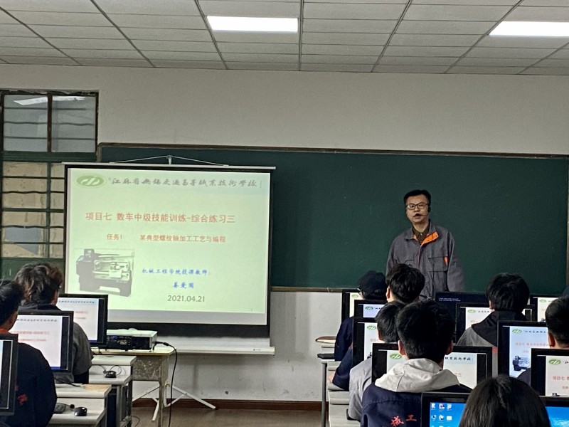 姜老师授课的课题为典型螺纹轴的加工工艺与编程,从复习提问、引入新课、展示课题图纸、加工工艺分析和课堂小结等几个方面展开教学,授课过程中采用了提问、学生讨论等多种教学手段,并且融入了思政元素。课后展开了评课,参加评课的老师各抒己见,既肯定了本次课取得的良好教学效果,同时也指出了存在的一些问题。