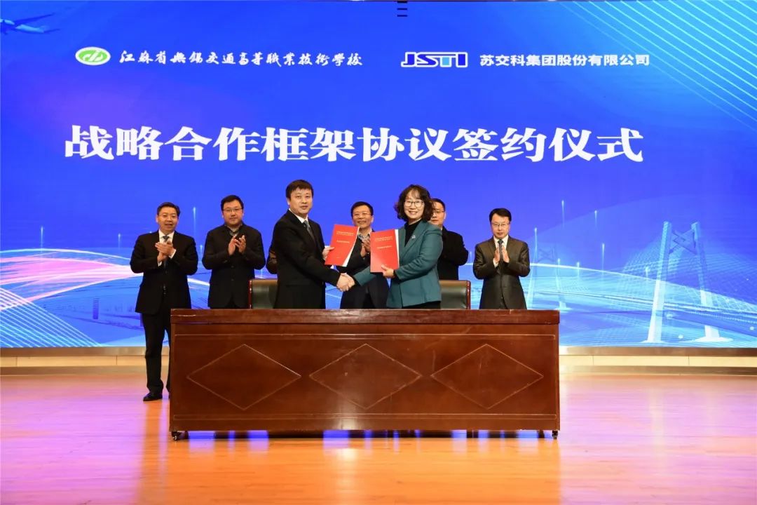 学校党委副书记、五级职员朱雨兰与苏交科集团副总裁计月华共同签订战略合作协议。耿兴华副校长与苏交科副总裁王卫共同签订共建生产性交通工程试验检测中心协议。