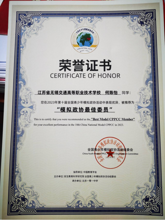 由蒋玉成、姚翕越、唐辰宇、韩梦怡、何陈怡、宿燕婷等青年学生组成的“模拟政协委员”小组,展示“将孝慈助老爱心志愿服务纳入职业学校劳动教育的必修课”的提案,通过对政协委员履职方式和政协会议组织形式的模拟,近距离体验人民政协制度。小组成员制作了视频和PPT,从医疗、教育、科协、记者、妇联、经济不同领域围绕提案进行阐述。学生们积极回答评委提问,将视野从“学校小课堂”转向“社会大课堂”,他们对所选话题的调研深度、覆盖广度以及建议的精细度,得到了现场嘉宾、评委和老师的好评。学校荣获最佳展示团队、优秀提案奖和最佳组织奖三个奖项,蒋玉成荣获最佳领导力、最佳新闻发言人、最佳风采奖三个大奖,宿燕婷、姚翕越、何陈怡同学荣获模拟政协最佳委员,姚翕越还荣获最佳记者奖,王 涛、蒋治国两位老师荣获最佳指导老师,蒋治国老师还荣获最佳主持人奖,个人合计获奖10人次。
