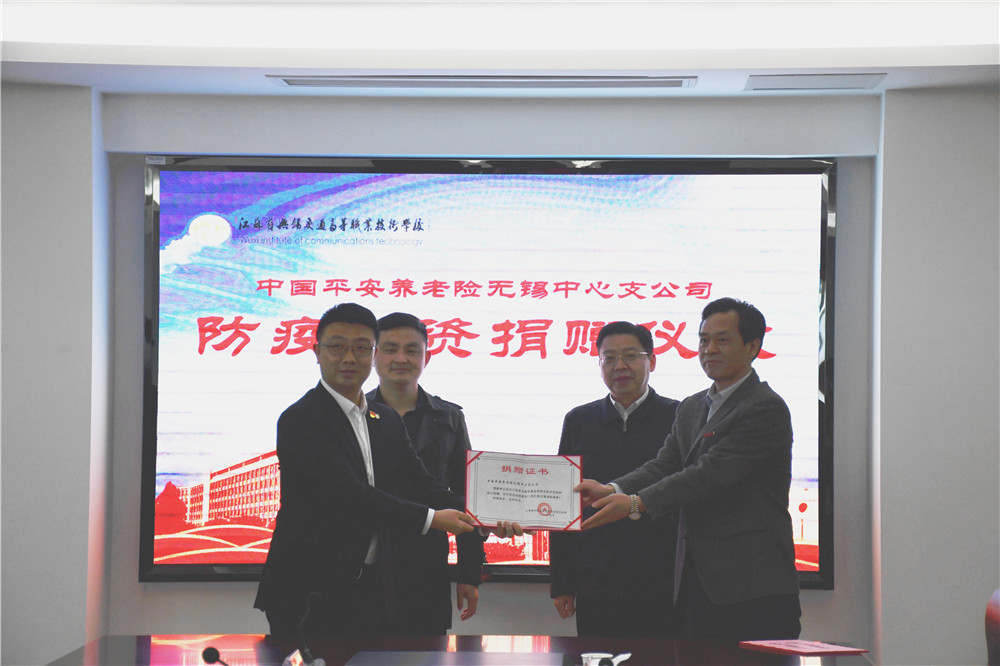 4月23日,学校举行防疫物资捐赠仪式。会上,中国平安养老险无锡中心支公司为学校捐赠10000只口罩,无锡市教育局高职处副处长蔡锦山、中国平安养老险无锡中心支公司党支部书记谢琨、开云官方站在线登入党委书记李虎出席会议。