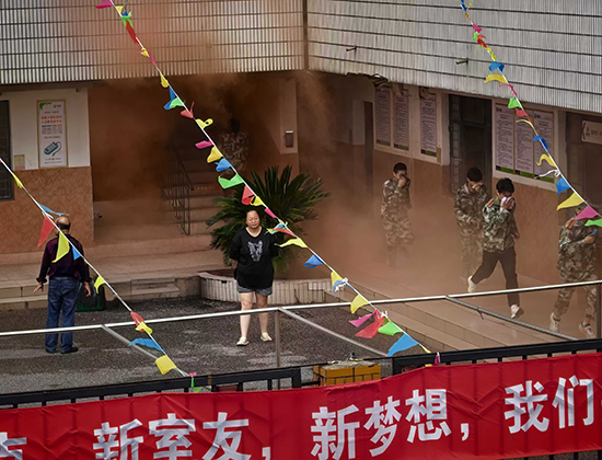 随着模拟烟雾的释放及火灾警报声响起,演练正式开始。新生们在老师的引导下,迅速拿起湿毛巾捂住口鼻,弯腰低姿沿指定疏散路线快速有序撤离至宿舍楼前操场。过程中,各疏散通道值守人员及时疏导人流,避免拥挤堵塞,仅用 1分 35 秒,全体新生便完成安全集结,无一人遗漏、无秩序混乱情况。