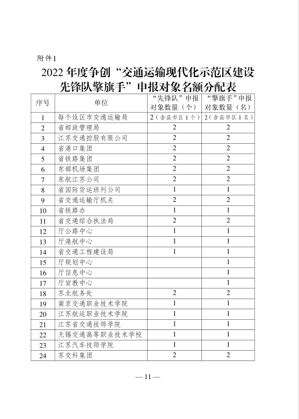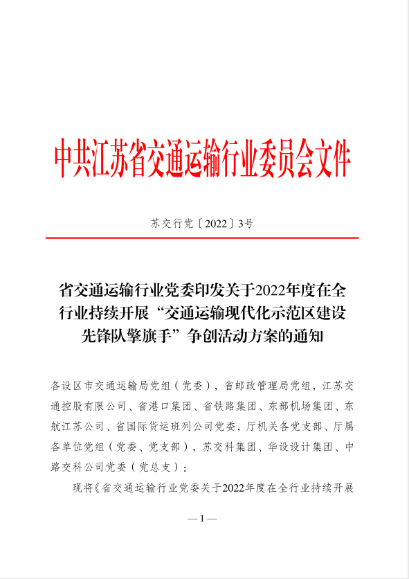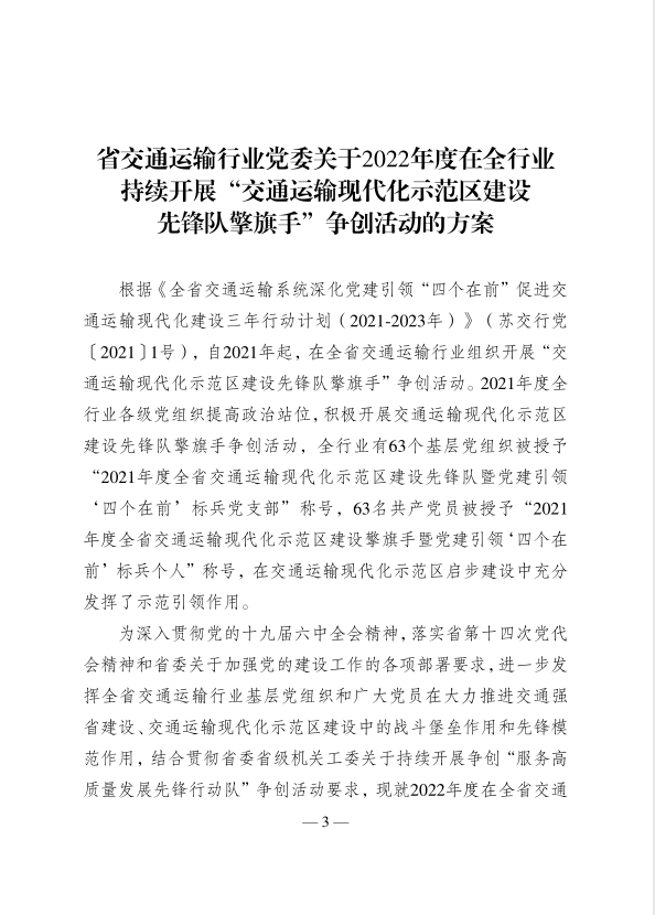 附件:《省交通行业党委印发关于2022年度在全行业持续开展“交通运输现代化示范区建设先锋队擎旗手”争创活动方案的通知》