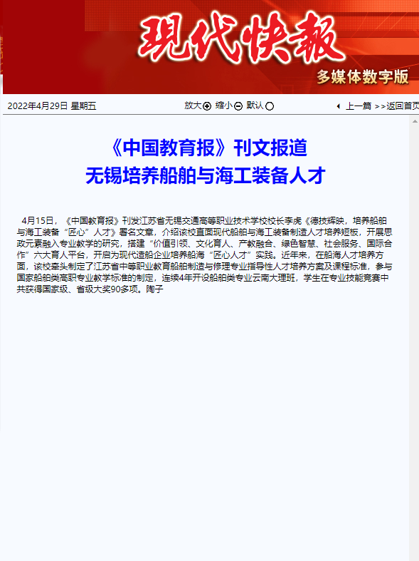 现代快报:《中国教育报》刊文报道 无锡培养船舶与海工装备人才