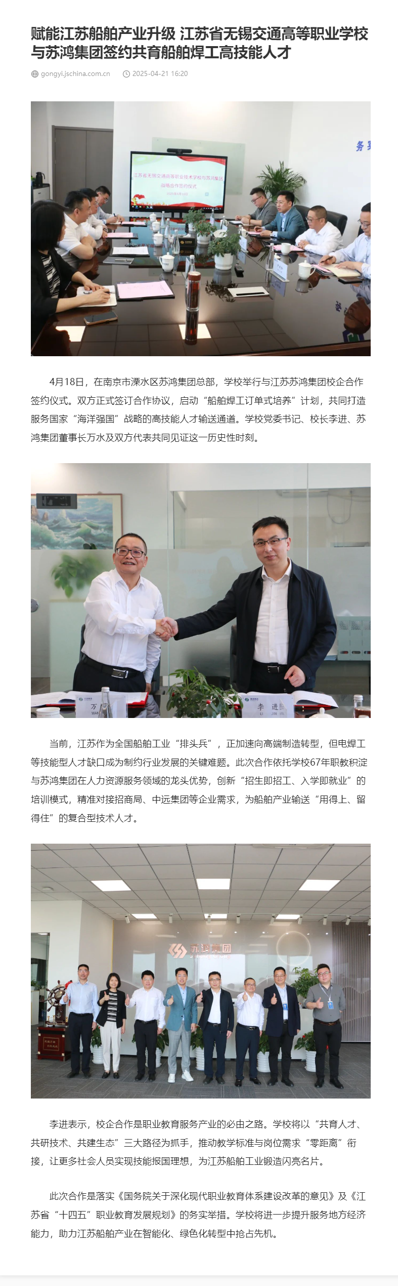 中江网:赋能江苏船舶产业升级 江苏省无锡交通高等职业学校与苏鸿集团签约共育船舶焊工高技能人才