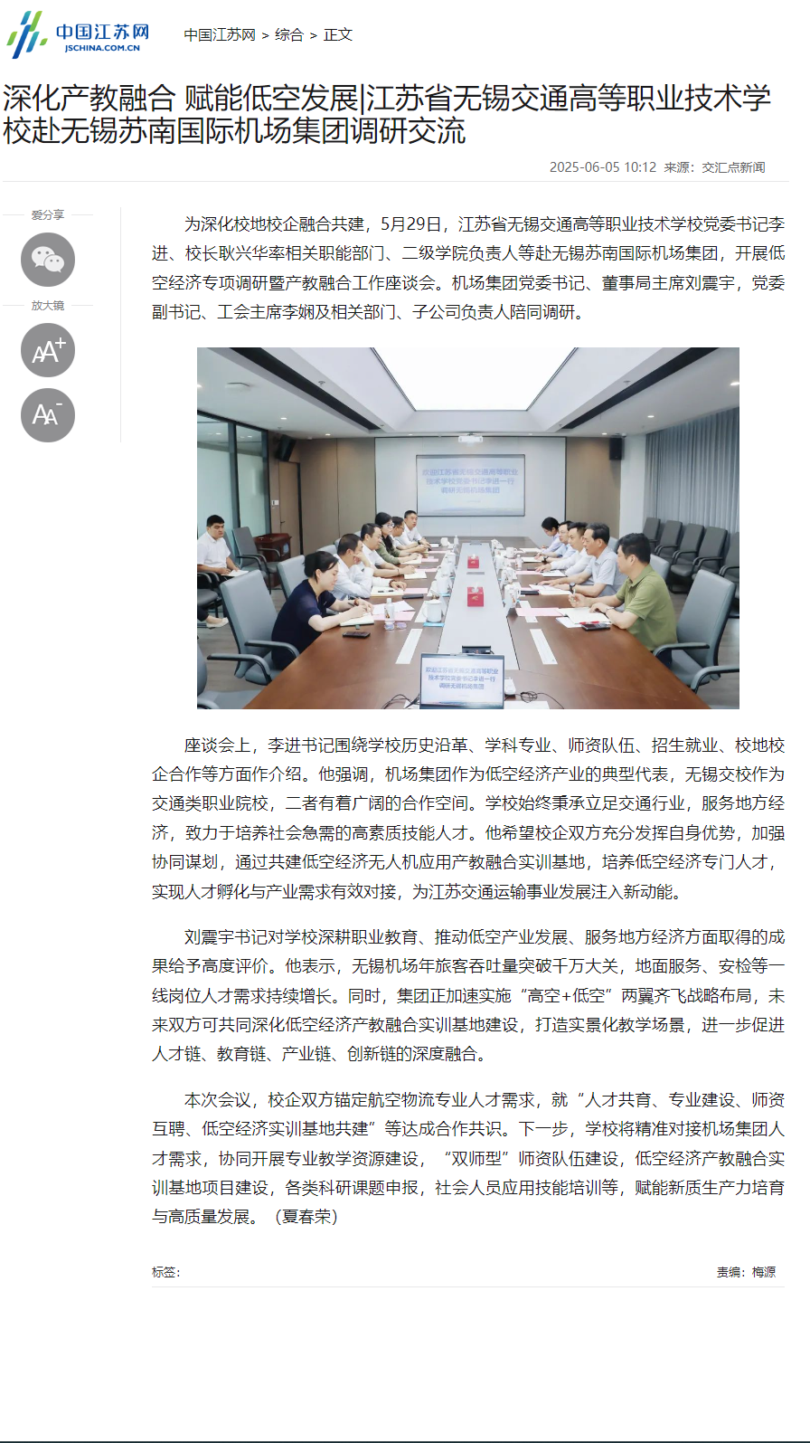 中江网:深化产教融合 赋能低空发展|开云官方站在线登入赴无锡苏南国际机场集团调研交流