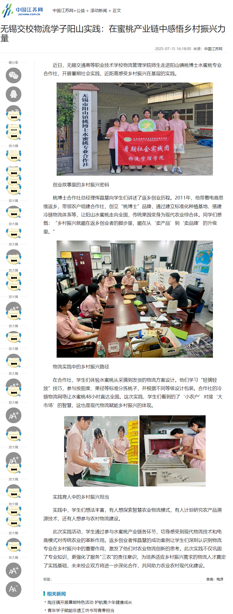 无锡交校物流学子阳山实践:在蜜桃产业链中感悟乡村振兴力量_中国江苏网 (jschina.com.cn)