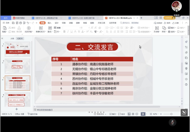 第二阶段由组内所有办学单位《哲学与人生》校级集体备课牵头人集体备课。无锡交通分院王龙生教授作题为“党的二十大精神融入《哲学与人生》课程教学”的专题讲座,各协作组代表就《哲学与人生》课程教学进行交流发言,张海滨副教授对下学期《哲学与人生》集体备课重点任务进行了部署。
