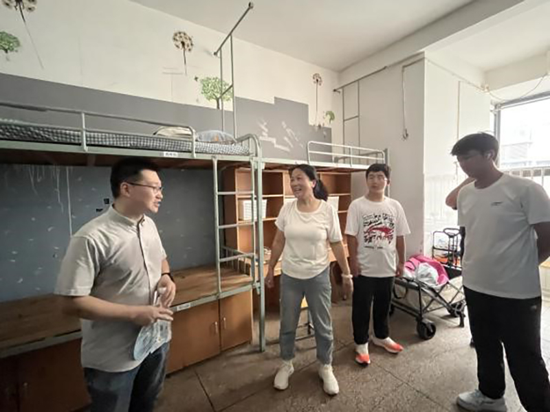 上午9时,学院领导前往新生宿舍楼,看望刚安顿好的新生,了解他们的住宿环境与生活需求。院领导仔细查看宿舍的床铺、衣柜、空调等设施,询问新生住宿情况、生活用品有无缺失,并现场回答家长学生问题。