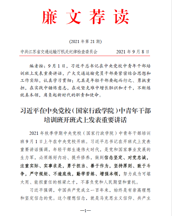 2021年廉文荐读第21期——习近平在中央党校(国家行政学院)中青年干部培训班开班式上发表重要讲话