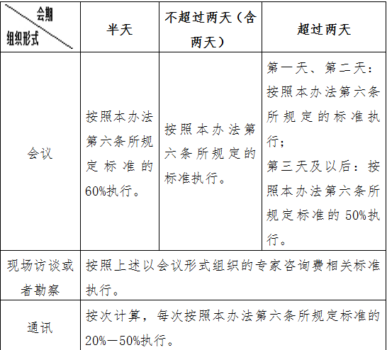 第九条 不同形式组织的专家咨询活动适用专家咨询费标准如下: