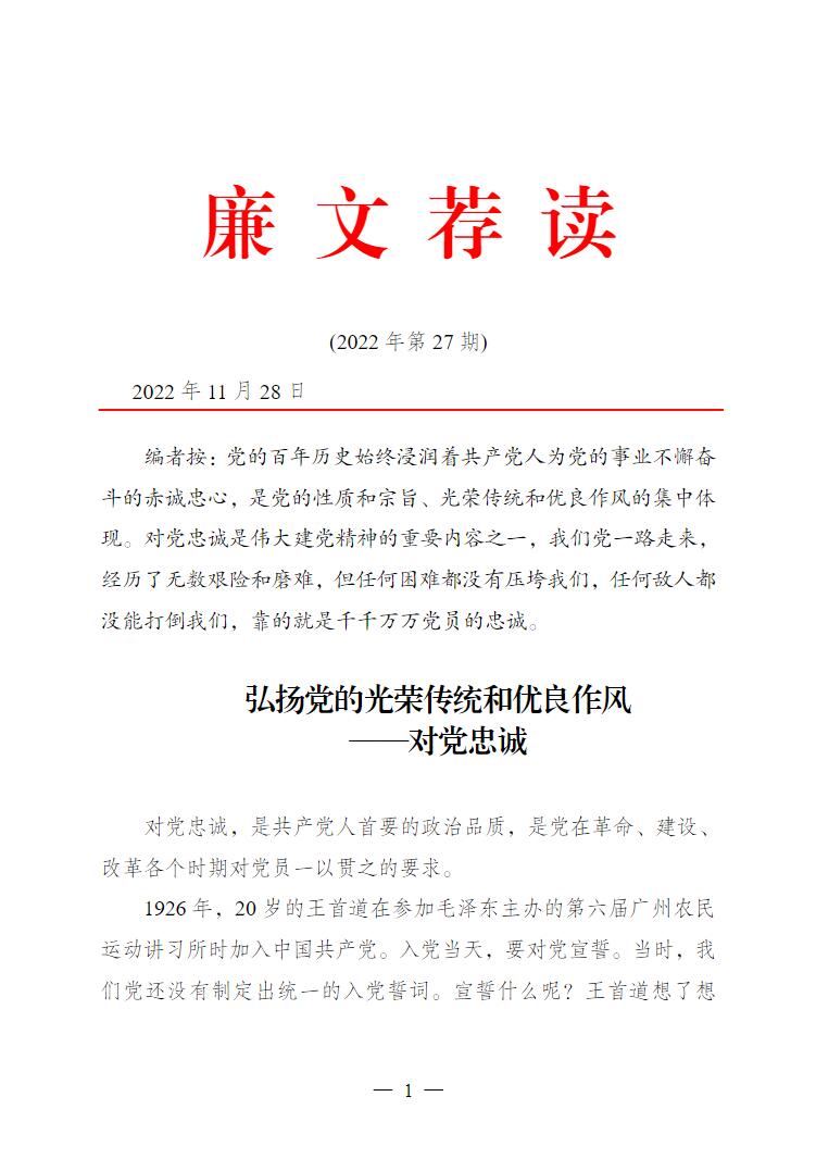 2022年廉文荐读第27期——弘扬党的光荣传统和优良作风——对党忠诚