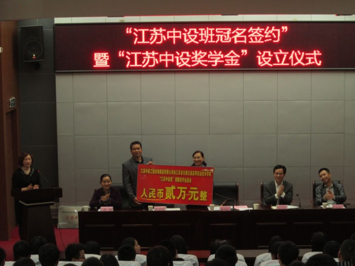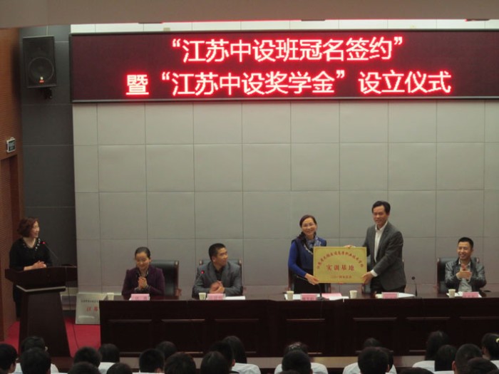 交通工程系举行“江苏中设班”冠名签约暨“江苏中设奖学金”设立仪式 交通工程系 为满足企业引进发展人才的需求,促进毕业生就业,2014年4月23日,交通工程系与江苏中设咨询集团有限公司在学术报告厅隆重举行“江苏中设班”冠名签约暨“江苏中设奖学金”设立仪式。江苏中设工程咨询集团有限公司部分领导、副校长耿兴华、交通工程系主任陈建明、交通工程系11级、10级全体学生及班主任参加本次活动。交通工程系书记毛兰霞主持会议。 首先,陈建明主任就“江苏中设班”冠名签约和奖学金设立作了简要介绍。 接着,双方进行以下仪式:江苏中设工程咨询集团有限公司与无锡交通高等职业技术学校领导签订冠名班协议、江苏中设工程咨询集团有限公司向无锡高等职业技术学校授“江苏中设”冠名班牌一块、无锡交通高等职业技术学校向江苏中设工程咨询集团有限公司授“江苏省无锡交通高等职业技术实训基地”铜牌一块、江苏中设工程咨询集团有限公司向交通工程系捐赠奖学金基金贰万元整。 签约赠牌仪式结束后,江苏中设工程集团有限公司廖芳龄副总裁代表公司作了讲话。她的讲话高度评价了此次签约合作仪式,充分体现了其公司在注重质量的同时,不忘人才培养,并对学校、系部、和在座的同学们提出了真诚的期望和祝愿。 最后,耿兴华副校长作重要讲话。他充分肯定了开展此次校企合作的举措,真诚感谢合作双方,殷切希望冠名班的同学把握机会、努力学习,为企业发展作出贡献。