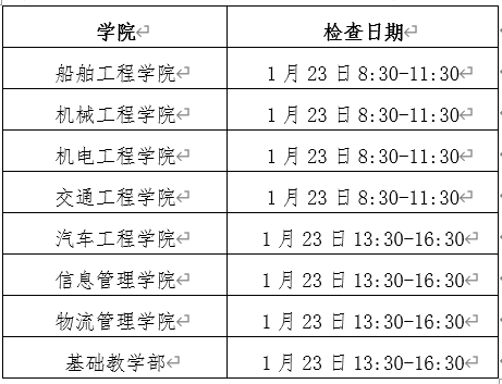 1.检查时间安排:1月21日教研室自查;1月22日院(部)抽查;1月23日学校检查。学校检查日程安排如下: