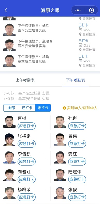 为贯彻落实《交通运输部海事局关于应用信息化监管手段加强船员培训管理工作的通知》,提高培训质量,促进高素质船员队伍建设。学校主动适应新形势下船员培训要求,及时指导学员做好线上考勤工作,努力完成培训教学任务。2024年3月5日至8日,2024年第一期内河船舶船员基本全培训55名学员以及培训老师运用“海事之眼”微信小程序,进行培训考勤。以教师、学员培训时的自主“打卡”代替传统的纸质记录考勤方式,不断提升船员培训质效。