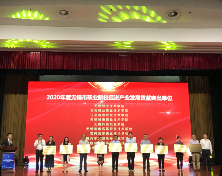 5月22日上午,2021年无锡市职业教育活动周启动仪式在江苏信息职业技术学院举行。在启动仪式上,集中表彰了2020年度无锡市职业院校产业发展贡献突出单位。我校科技与合作处尹爱华处长上台领奖。无锡市教育局、无锡市发展和改革委员会、无锡市工业和信息化局、无锡市人力资源和社会保障局、无锡市农业农村局、无锡市工商业联合会、共青团无锡市委员会等部门的领导出席了启动仪式。