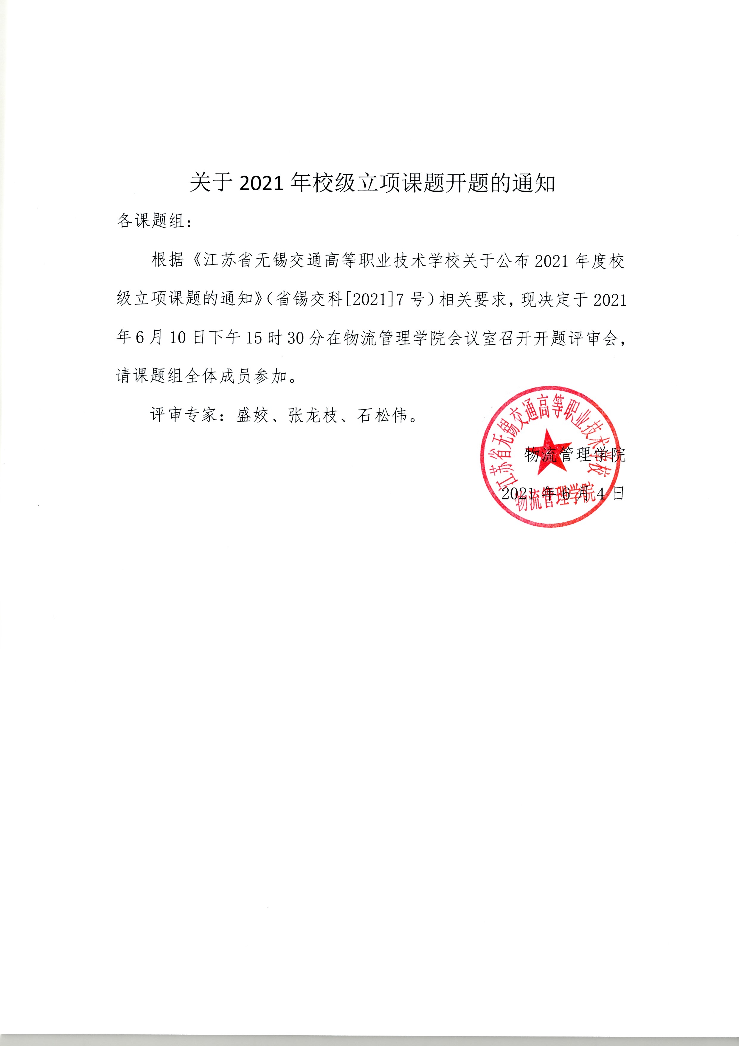根据《开云官方站在线登入关于公布2021年度校级立项课题的通知》(省锡交科[2021]7号)相关要求,现决定于2021年6月10日下午15时30分在物流管理学院会议室召开开题评审会,请课题组全体成员参加。