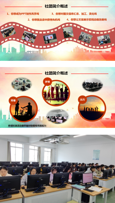炼机会的平台,是大学生活不可或缺的一部分,也可让相同爱好的同学齐聚一堂、携手奋斗、共同成长。社团招新至今已走过三个春秋,PPT幻动社始终践行“立足学院,面向全校,塑造优秀文化,培养技能人才”的发展目标。