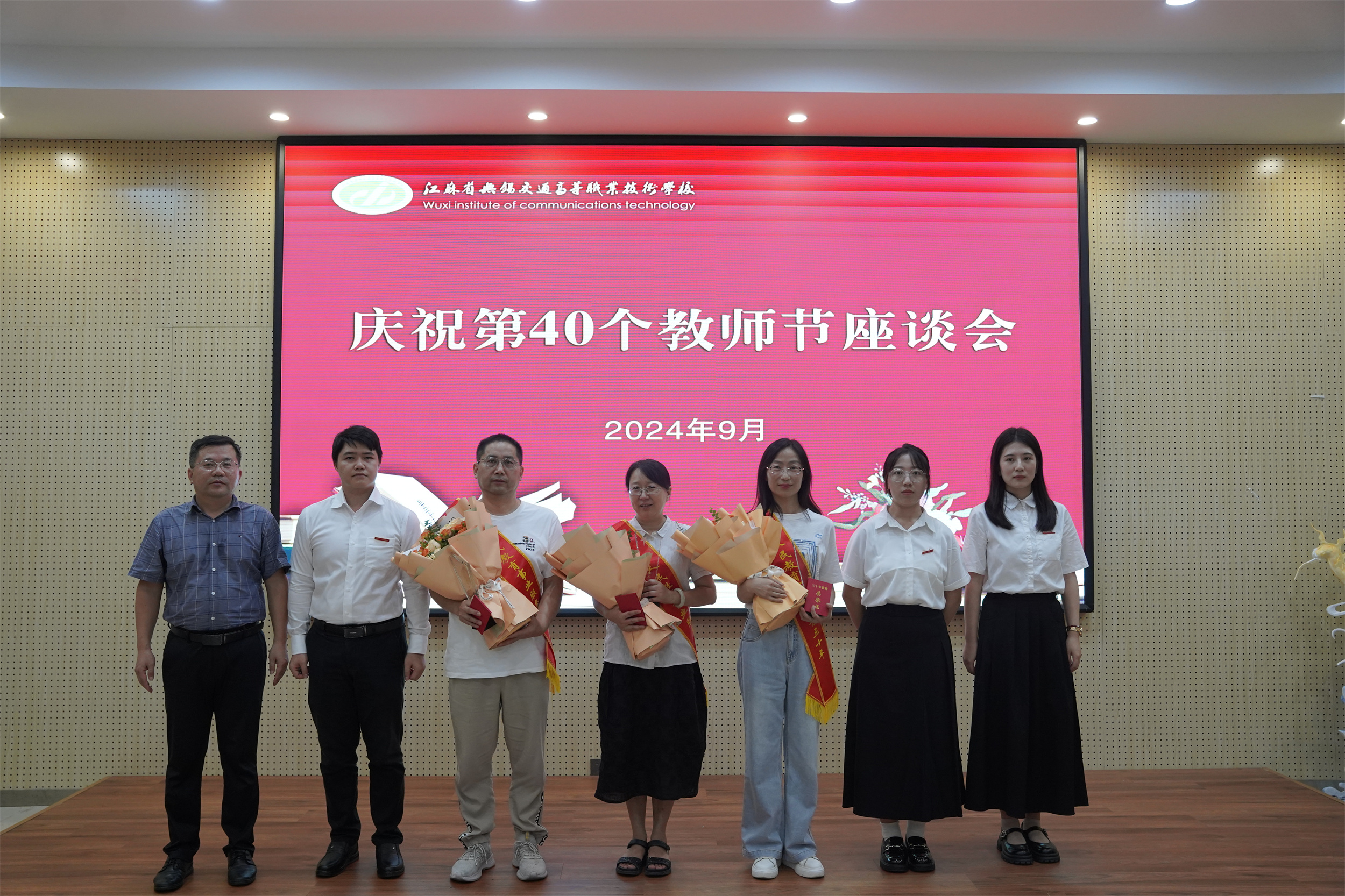 座谈会上,朱雨兰宣读江苏省交通运输厅第40个教师节慰问信。范次猛宣读“为人民教育事业服务三十年”教育工作者名单,颁发了证书和奖杯。王珏宣读了表扬通报,同时举行新入职教师宣誓的仪式。