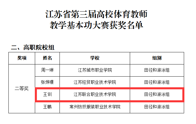 近日,由江苏省教育厅主办的江苏省第三届高校体育教师教学基本功大赛在南京工业大学和南京信息职业技术学院举行。本次大赛共有全省141所高校310名教师参赛。我校王训老师凭借出色的专业素养和教学能力,在众多参赛教师中脱颖而出,获得二等奖的好成绩,实现学校在该赛事中的历史性突破,展现我校体育教师扎实的专业素养和良好的教学水平。