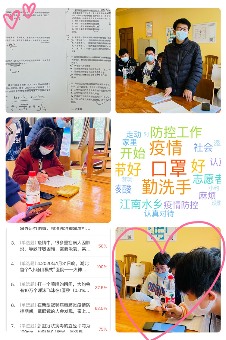 活动前,指导老师袁雪平老师广泛查阅资料,精心筛选疫情防控中与物理相关的案例,编辑成题目上传至学习通。活动中,袁老师首先明确本次活动的目的和形式,随后学生现场加入班课,独立完成测试并提交。通过测试成绩进行排名,评选出一、二等奖,并颁发纪念品。随后,师生结合测试中涉及的部分疑难问题,如戴口罩的必要性、红外线测温原理、负压实验室的优点等再次进入深入探讨。最后,大家分享活动心得,并就“作为学生如何做好疫情防控工作”“疫情给我带来的影响”等问题展开讨论。