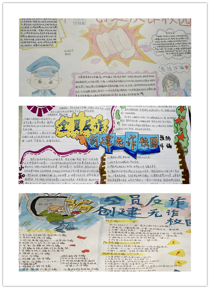 本次手抄报比赛的举办,进一步让同学们了解电信防范安全知识,增强了电信安全防范意识。切实提高了防电信诈骗的知晓率和普及率,为创建平安校园打下了坚实的基础。