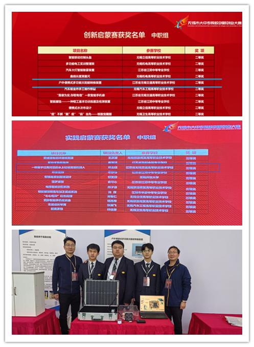 信息管理学院共三支师生队伍入围决赛。其中,成江老师指导的项目《户外便携式多功能太阳能转换装置》获创新启蒙赛中职组二等奖,余永胜老师指导的项目《一种基于江南河道的水上垃圾清理机器人》获实践启蒙赛中职组三等奖,曹淳老师指导的学生团队在物联网应用技术专项赛高职组中获得三等奖。