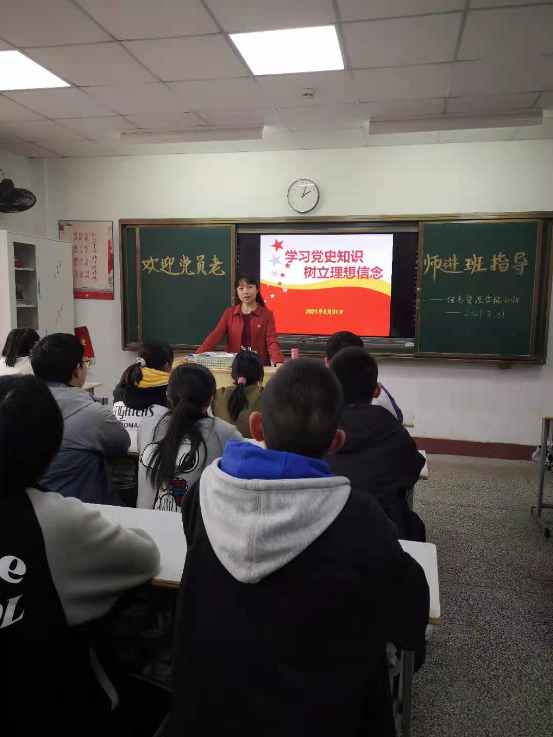 为进一步加强党史学习教育,引导学生牢固树立正确的世界观、人生观和价值观,帮助学生坚定理想信念,明确学习目的和努力方向,切实加强学生的思想政治教育。3月31日下午,组织人事处党支部书记邵敏珠走进信息管理学院201611班,开展“学习党史知识,树立理想信念”主题教育活动。