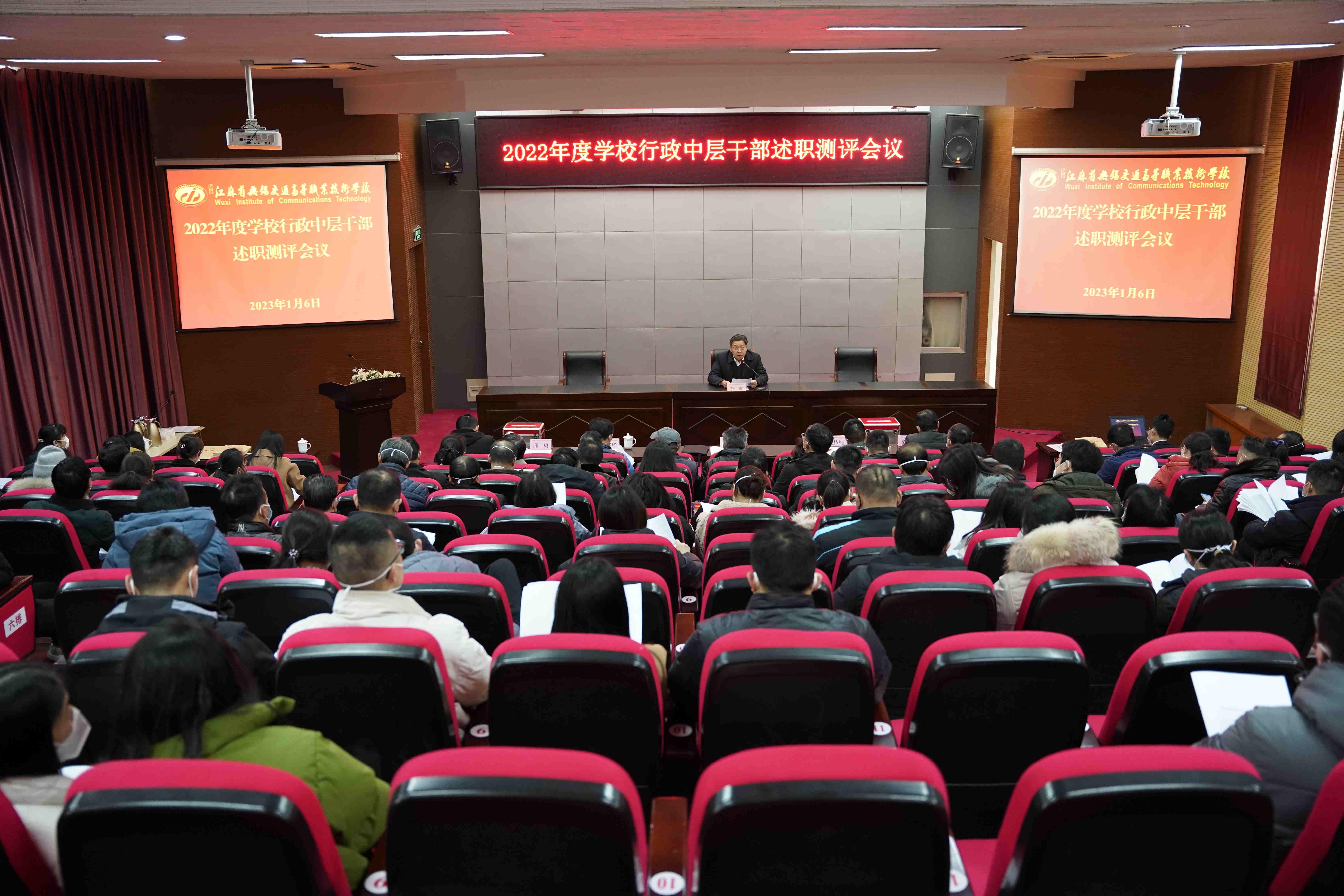 1月6日下午,学校在学术报告厅召开2022年度行政中层干部述职测评会议。学校全体校领导、全体中层干部、院部教师代表、行政处室管理人员代表130余人参加了此次会议,会议由校党委书记、校长李虎主持。