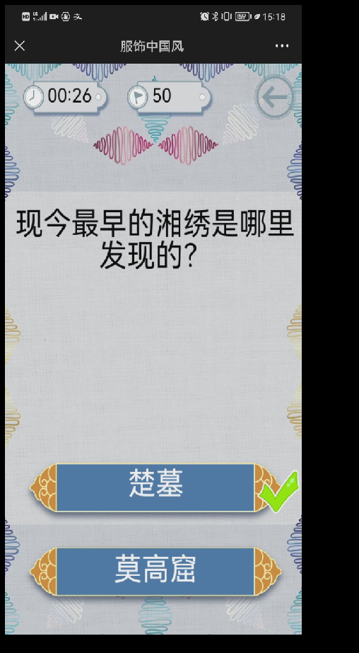 本次线上活动有三个板块:服饰穿越、国风竞答赛、国风绣技。在第一个板块中,一幅幅竖版画展示了唐代、宋代、明代,清代的传统服饰,让社员们重新领略中国不同朝代的服饰特点及变化,充分感受服饰文化的璀璨和丰富多彩。第二个板块中,通过几道知识竞赛题目,让社员们对自己掌握的服饰文化知识有更深入的了解。在第三个板块中,以有趣的动画视频介绍中国绣技的历史发展技法,让社员们了解苏绣、湘绣等传统名绣对中华传统服饰的点睛之用。在线上活动的最后,社员们尝试用最短的时间,修复一张清代传统旗服的拼图。
