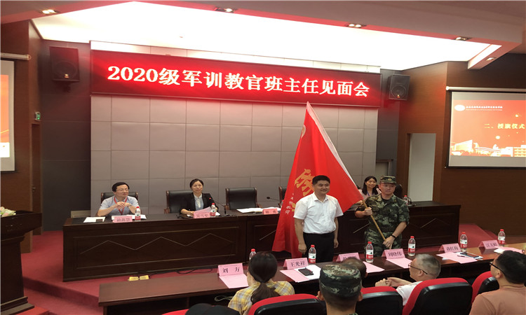 见面会上首先由冯处长宣读了2020级新生班主任和教官名单,读到名字的教官和班主任起立互相见面认识。会议的第二项议程由邢校长为承训军训团授旗。赵大队长代表承训教官做出表态,一定恪尽职守,确保安全,切实做好今年军训工作。