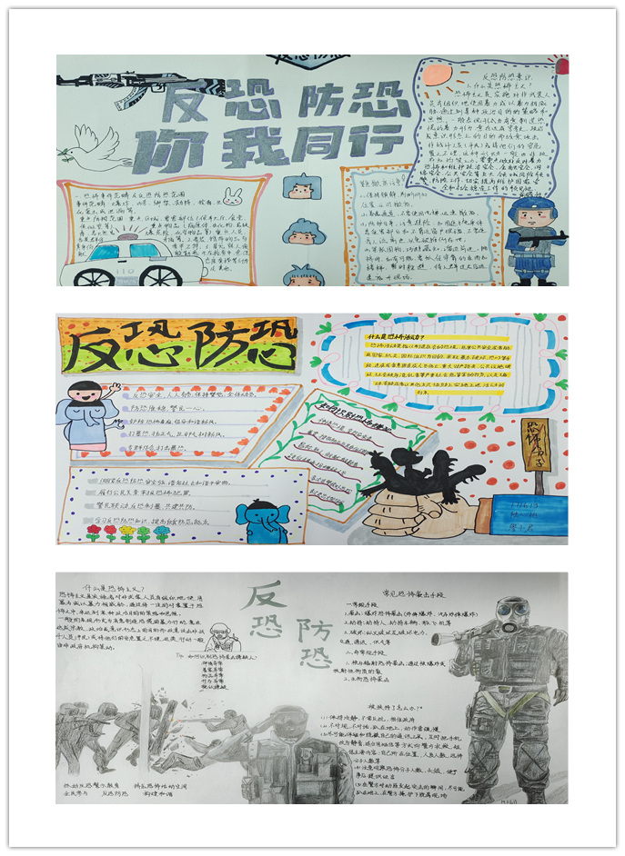 各班同学积极参与,所绘制的手抄报主题鲜明,图文并茂。制作反恐手抄报,不仅普及了学生的反恐知识,宣传恐怖主义的危害,还提高安全意识,有效地防范和保护自己。切实提高广大师生反恐怖意识和避险能力的同时,更为校园、为家园、为社会安全筑起一道坚实防线。