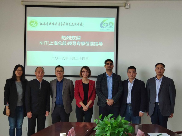 2018年10月24日上午,NIIT华东区总监张丽琼女士、NIIT区域负责人丁联铭先生、NIIT发展经理Ritesh Gaur先生、NIIT市场经理姚红女士一行四人莅临我院,深入NIIT项目班级,随堂听取外教Mananjay的现场课,并在课后与学生进行亲切交流,了解学生对NIIT模块的学习情况,对我院学生的表现情况给予充分肯定和赞赏。
