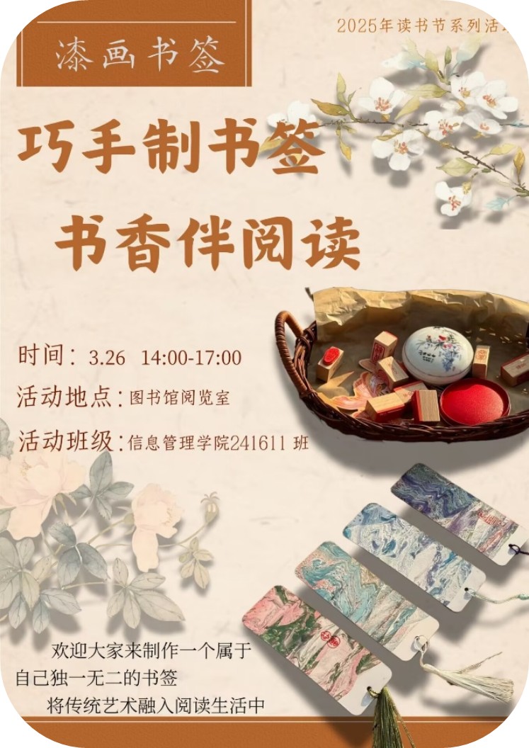 为深化2025年学校读书节系列活动,推进非遗文化传承与创新人才培养,3月26日下午,图书馆联合信息管理学院241611班在阅览中心举办“漆画书签”非遗文化实践活动。本次活动特邀请了基础教学部叶玲老师担任指导,通过“理论讲授+沉浸体验”模式,打造“馆班共建”育人新范式。